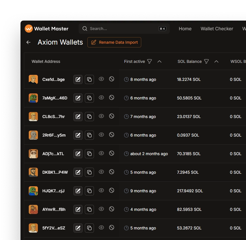 Wallet Master centralizes your research, offering instant on-chain data via Discord bot commands and Web App for large-scale wallet import, custom filtering, and performance tracking.