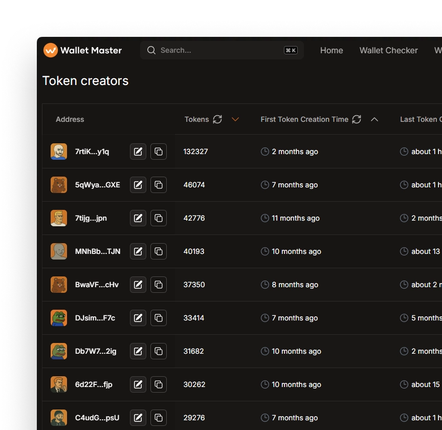 Wallet Master is an analytics platform built to give Solana traders critical clarity. Our tools are designed to help you see what other traders miss by analyzing data at a massive scale, identifying top-performing wallets before they trend, analyzing the success of token creators, and tracking the on-chain flow of smart money to get ahead of the market.